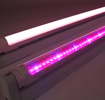 尺寸 长度:通常有 0.6 米、0.9 米、1.2 米等,部分特殊需求的led灯管长度可能会有不同。 直径:T8 灯管的直径一般为 25.4mm。 电气参数 输入电压:一般为 AC85-265V 或 AC180-240V 等宽电压范围,郎特 T8 一体植物led灯管输入电压为 AC180-240V。 功率:常见的有 9W、14W、18W、28W、36W 等,不同长度的灯管功率不同,例如 0.6 米单排为 9W,双排为 18W;0.9 米单排为 14W,双排为 28W;1.2 米单排为 18W,双排为 36W。 功率因数:通常要求较高,一般在 0.9 以上,如部分产品功率因数可达 0.95,以提高电能利用率。 光学参数 光通量:光通量因功率和产品质量而异,如一些 18W 的 T8 全光谱植物生长灯管光通量可达 4680 流明。 光谱范围:全光谱通常涵盖从紫外线到红外线的较宽波长范围,包括对植物光合作用和生长发育有重要影响的蓝光(420nm-500nm)、红光(620nm-750nm)等,还可能有少量的紫外光(280nm-315nm)和远红光(750nm-1000nm)。 PPFD:不同品牌和型号的 PPFD 值不同,如深圳市郎特科技有限公司的 T8 全光谱植物生长灯在特定距离和面积下 PPFD 可达 200umol/m²*s 左右。 其他参数 LED 芯片品牌:常见的有三安光电等知名品牌。 外壳材质:一般有铝、PVC 等,铝材质外壳具有较好的散热性能,可延长灯管使用寿命。 防护等级:部分产品防护等级为 IP20,只能在一般干燥环境中使用;也有防护等级更高的,如 IP54、IP65 等,可在更恶劣的环境中使用。 寿命:通常在 30000 小时到 50000 小时以上,如致艺光电的 T8 一体植物灯管寿命可达 50000 小时